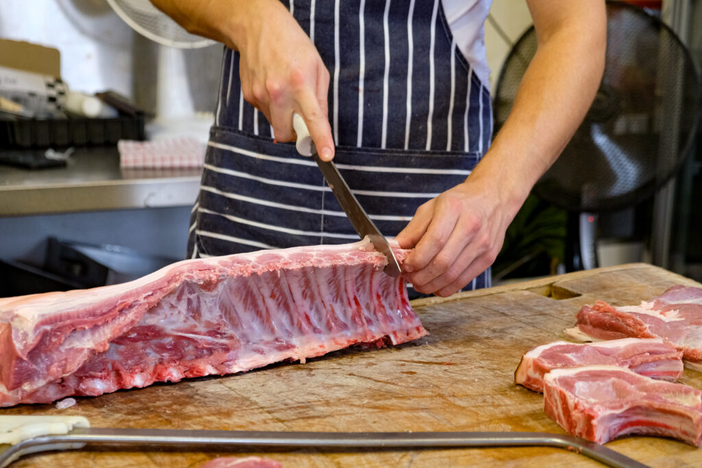 We’re a farming and butchery business selling high-welfare, home-bred meat, seasonal fruit and vegetables as well as other bits and pieces from carefully selected local suppliers. This allows us to offer total traceability for everything that leaves our shop. The meat from our farm includes beef, lamb and pork. Our beef comes from native breeds, such as Dexter, Aberdeen Angus and Hereford. Whenever possible, our cattle are kept outside. They are mainly grass-fed with a supplement of local grain.